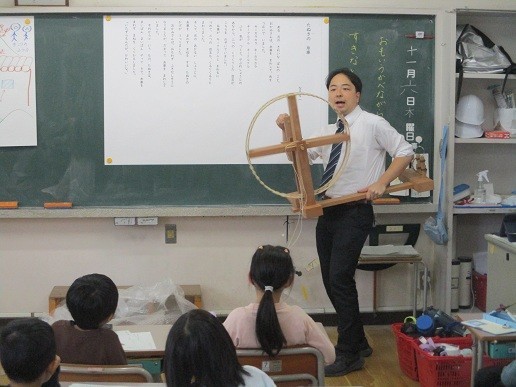 学習成果発表会の展覧会会場が整ってきました。展覧会は来週より開催いたします。どなたでもご覧いただけます。対象学年(2年生、5年生)以外の保護者の皆様も、ぜひお立ち寄りください。3枚目は1年生の国語の授業です。担任が持っているのは糸車です。「たぬきの糸車」を読み始めました。「キークルクル キーカラカラ」実物を見て、子供たちは興味深く読んでいました。