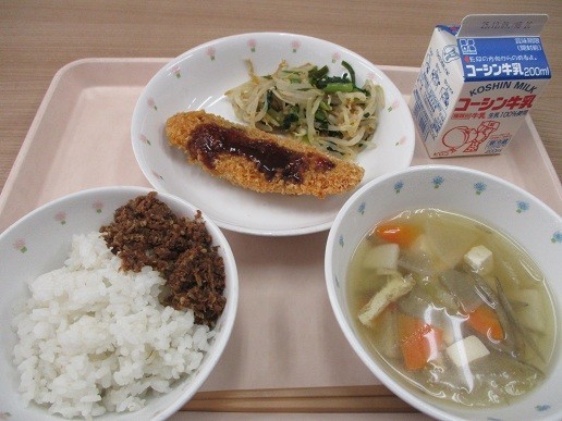 給食には鮭フライや根菜汁が出ました。根菜とは、土の中にある根と茎の部分を食べる野菜のことです。給食クイズです。今日の根菜汁には何種類の根菜が使われているでしょうか?