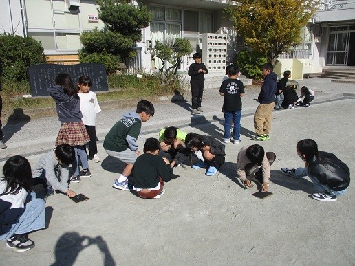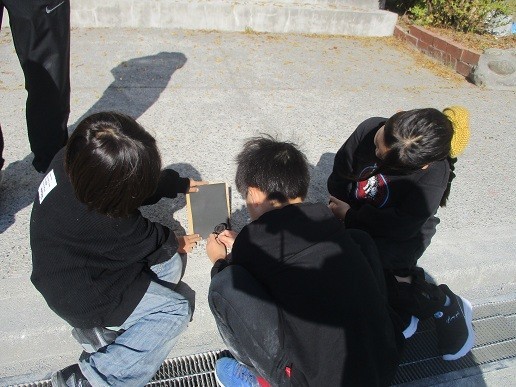 3年生は虫眼鏡で太陽の光を集める実験をしていました。焦点がばっちり合うと、黒い紙から煙が出て燃える様子を恐々と観察していました。