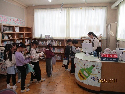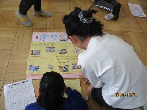 3組は読書の時間、返却や新たな貸し出しなど、図書館司書に手続きをしてもらっていました。2組は算数「長さ」の学習です。今日は1mのものさしで100cm=1mの長さを実感していました。1組は生活科「まちたんけん」のまとめの新聞づくりです。班で協力して取り組んでいました。