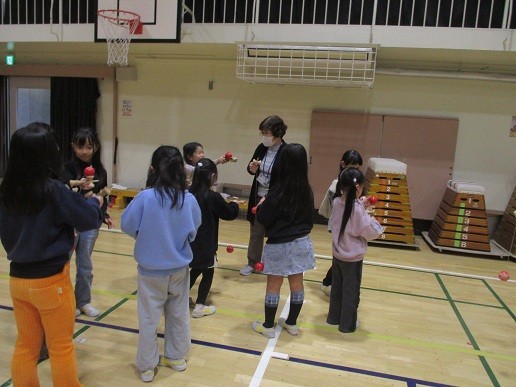 だるま落とし、羽根つき、けん玉、こま回し、2年生の生活科の学習です。来月は1年生に遊び方を教えます。まずは自分たちが楽しく遊べるように一通りの遊びを体験しました。凧揚げ、福笑いその他、冬休みにもたくさん遊んできてほしいと思います。