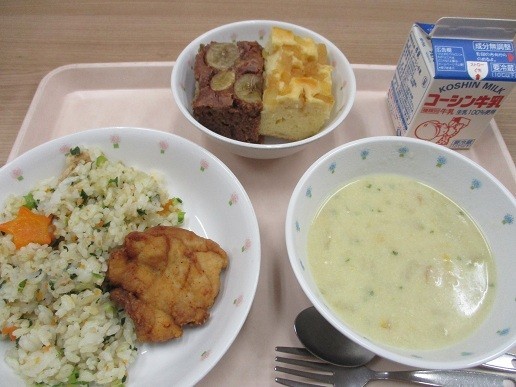 各学級で大掃除やお楽しみ会に取り組んでいました。2学期最後の給食はセレクト給食、りんごとシナモンのケーキ、バナナとココアのケーキのどちらかを選びます。(写真には両方が写っています。)今年はどちらが人気だったでしょうか?子供たちも給食を楽しみに学校にきた子も多かったと思います。
