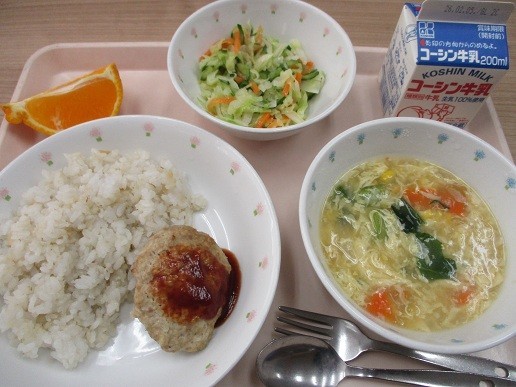 家庭科で6年生が考えた献立第3弾は、ガーリックライス、ハンバーグ、コールスロー、コーンスープ、デコポン、牛乳です。「みなさんが食べやすいように栄養を考えて献立を立てました。ハンバーグは人気の料理で、みんなが楽しく食べられるよう工夫しています。ハンバーグでたんぱく質、サラダでビタミンがとれるようにしました。」