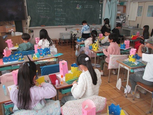 昨日に引き続き、5年生の看板です。なかなかの力作。立体的に作られているところがよいですね。2年生は、窓がある建物を作っていました。