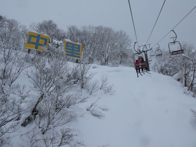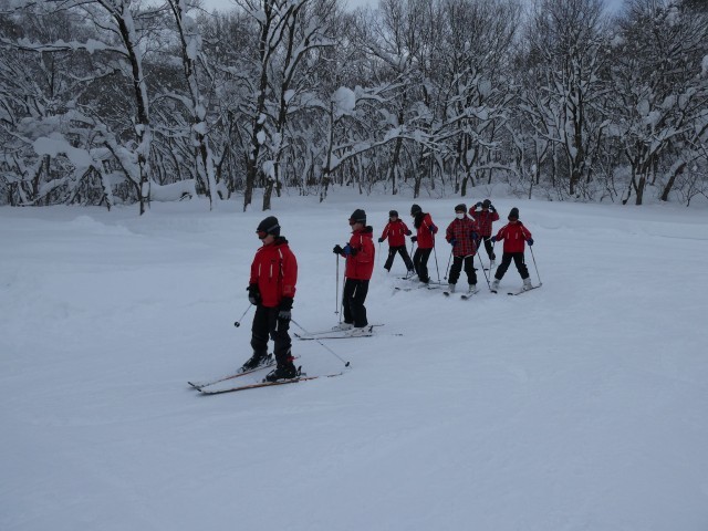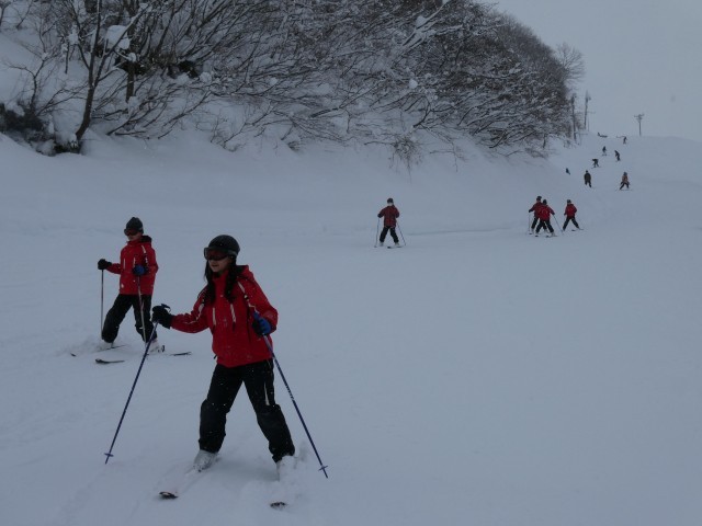 準備運動の後、スキーを履いて、早いグループはすぐにリフトに乗りました。最初の急斜面も何のその、森林コースもすいすいと楽しんでいました。雪が多い分、スキー場の雪質は最高です!
