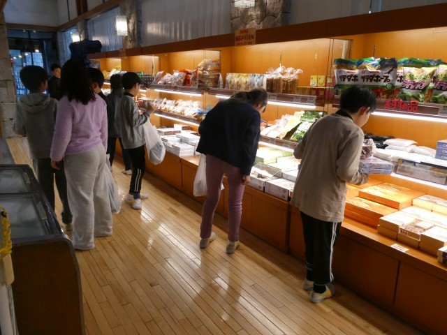 入浴と並行してお土産タイムです。家族や自分自身にお小遣いの中で買い物が済むよう、たし算の力が試されます。