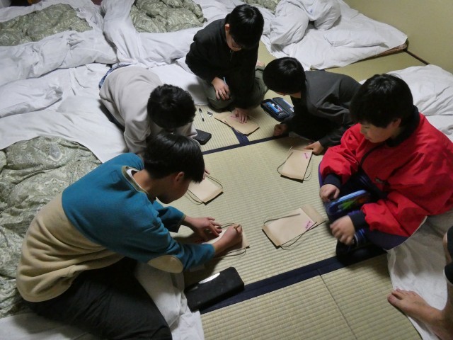 夕食後は、予定を変更して、明日の活動で使う米袋のデザインをしました。ウインタースクール最後の夜です。