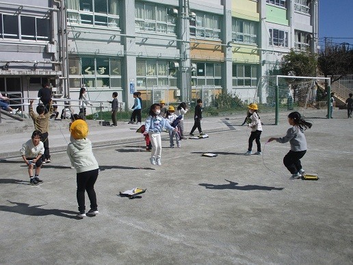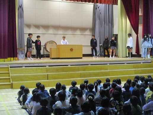 児童集会では、集会委員会が創作劇を披露しました。大きな声とジェスチャーで皆を笑わせていました。5年生は6年生へ送る会での「ソーラン節対戦状」を送りました。どちらが勝つか見ものです。縄跳びウイーク、昼休み1年生は自主的に練習しています。二重跳びができるようになった子もいます。