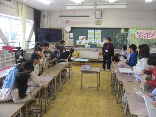 いじめに関する授業は、2-3と5-1で実施しました。2年生は絵本「もっとおおきなたいほう」を読み、次々に大砲を大きくしたり、派手にしたりした王様が実はキツネにだまされていたと気付いたときの気持ちを考えました。5年生は「桃太郎」について、退治された鬼の子供の立場で物語を考えることを通して、視点を変えるとものの見方が変わることを学んでいました。どちらも子供たちの素直な気持ちを引き出して授業を進めていました。