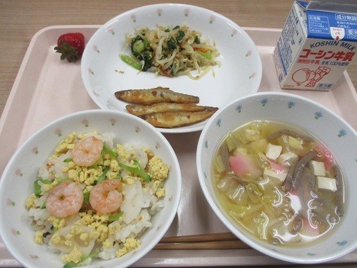 今日の給食はひなまつり給食です。えびちらし寿司は酢飯がとてもおいしかったです。子供たちも喜んで食べたことでしょう。