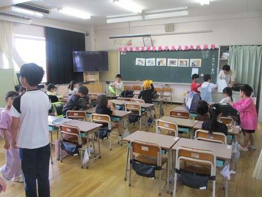 新学期に入り、2週目になりました。あいさつ隊は5年生です。玄関前で登校してくる児童に元気よくあいさつをしていました。1年生は朝の準備がずいぶん早くなりました。準備を済ませ、朝読書に入っている児童が増えています。2年生は学年で50m走の測定です。間もなく運動会モードに突入です。