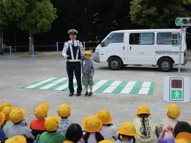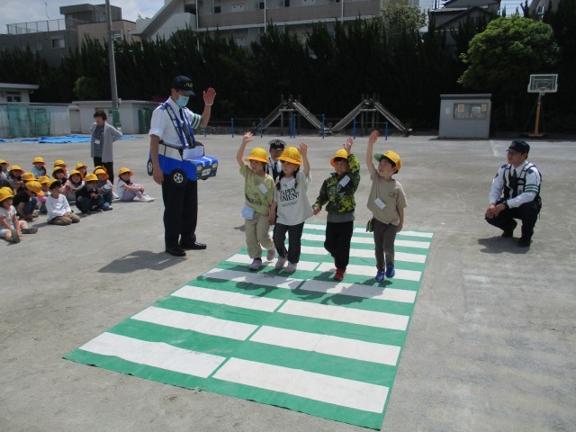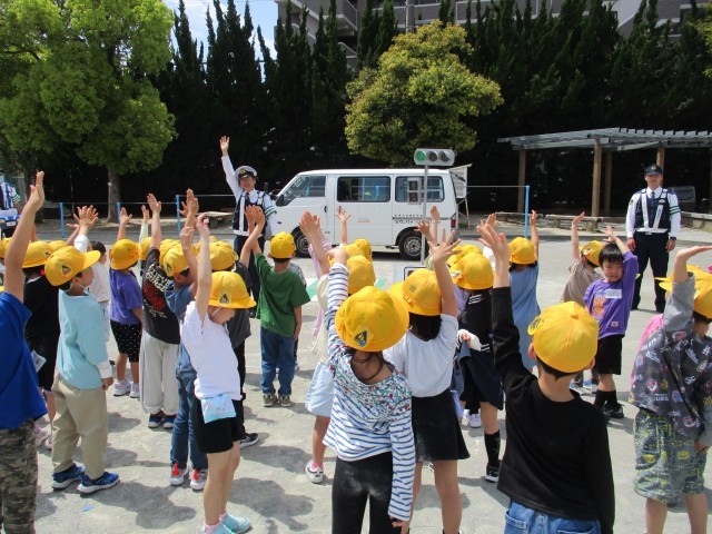 今日は、小松川警察の交通課のお巡りさんたちが来てくださり、交通安全教室を行いました。信号が青になったら、「右を見て 左を見て もう一度右を見て」手を挙げて横断歩道を渡ることを繰り返し確認し、実践しました。1年生たちはお巡りさんの話をしっかり聞き、大きな声で返事ができていました。普段の生活や登下校にも生かして、安全に道路を歩けるようになってほしいと思います。