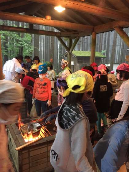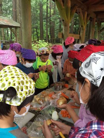 宿舎に到着して開校式を終え飯盒炊さんを行いました。外でカレーを作る体験は初めての子供も多かったみたいですがみんなで協力して頑張っていました。