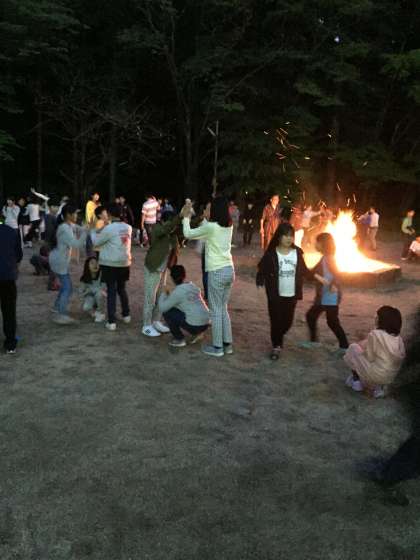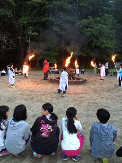 ハイキングから帰ってきて夕食を済ませいよいよ待ちに待ったキャンプファイアー。たくさんのゲームをしました。みんなは一緒にフォークダンスをしたかった相手と踊れたかな!?