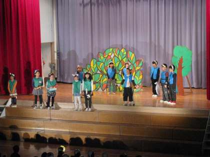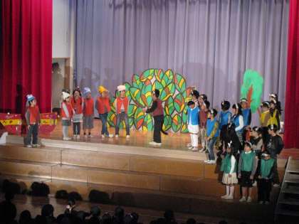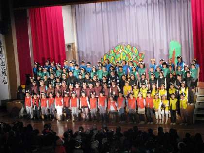 99人の子供たちがかわいい猫やねずみになりきり、元気に演技をすることができました。