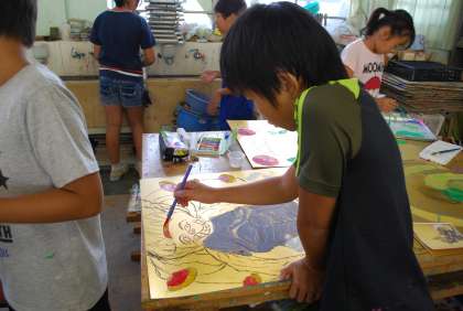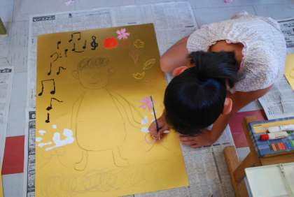 自分なりの神様をそれぞれが考えて、屏風のように大きい黄金の画用紙に描きました。