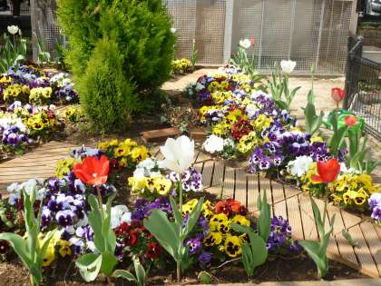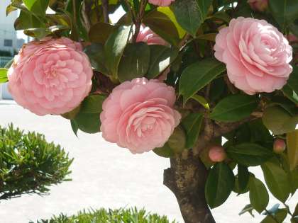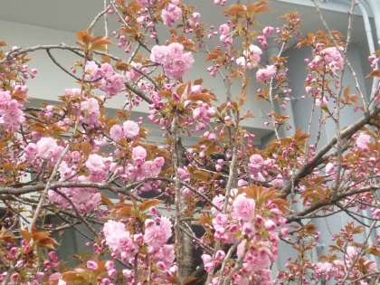 鎌田小学校の校庭も春爛漫です。校長室前の椿の花、体育館入口の花壇にはチューリップ(花壇ボランティアの方々が植えてくださった)、そして体育館横のサトザクラが満開です。