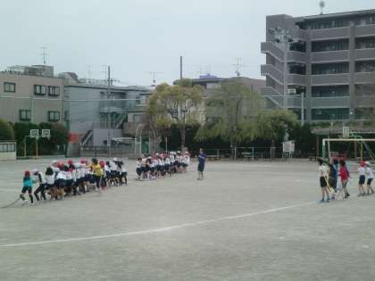 4月の学年合同体育は、クラス対抗ミニ運動会。種目は騎馬戦、綱引き、リレー。最後に得点が発表されると、歓声と拍手と涙に包まれました。「○組だって、がんばってたよ。」と勝ったクラスの温かい言葉に、学年の絆も深まりました。