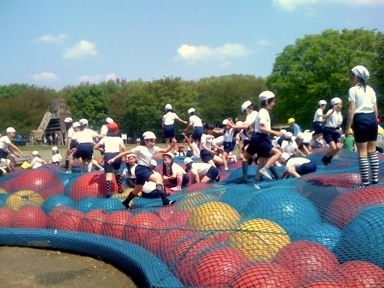 自由遊びが始まると、「わあっ」と声をあげて遊び場にかけていく子どもたち、クラスの仲間と楽しい一日を過ごしました。人気はわんぱくボール島です。ボールでできたトランポリンに子どもたちの笑顔もはじけていました。