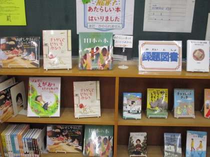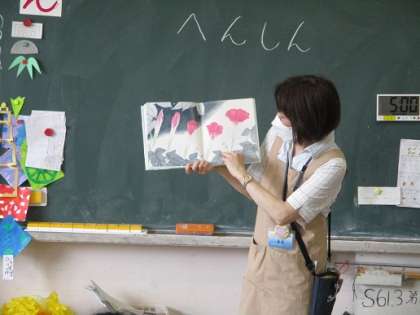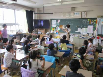 今年度から、隔週で、東部図書館の職員が来校し、教員と連携しながら環境整備や授業支援にあたっています。今日は1年生の教室でブックトークをしてくれました。「へんしん」をテーマに、アサガオやセミの話をしてくれました。
