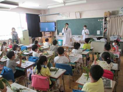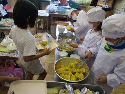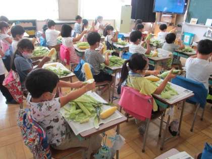 今日は2年生がトウモロコシさや剥きに挑戦しました。剥いたトウモロコシは給食に提供されました。2年生はいつも以上においしく感じたことでしょう。