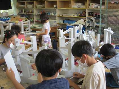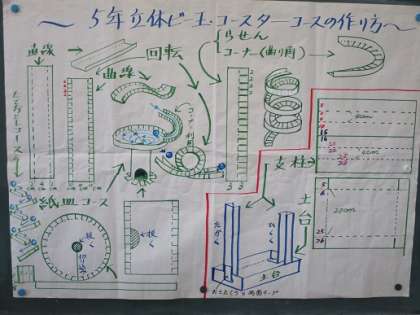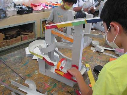 5年生の図工の時間です。工作用紙を使って、ビー玉が転がるコースターを作ります。柱をまっすぐに立てて、ビー玉がきれいに転がるようコースをつくり、何度も調整を繰り返します。思い通りに転がったときには、とても嬉しそうな顔をしていました。