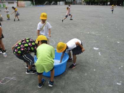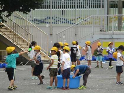 1年生の生活科で、シャボン玉づくりをしました。「大きなシャボン玉をつくりたい」「一度にたくさんのシャボン玉をつくりたい」など自分の願いをかなえるため、うちわやハンガー、モールなどを使い、工夫して取り組んでいました。