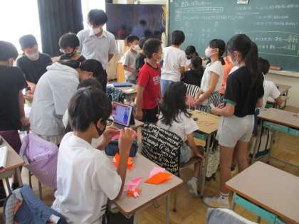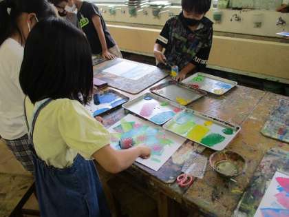 5年生は来月半ばにせまった「レッツ・プレイ鎌田」の準備を協力して進めていました。図工の時間には、ローラーを使って思い思いに表現活動を楽しみました。
