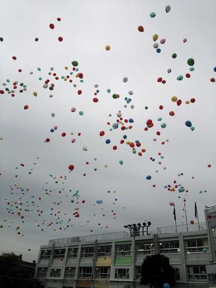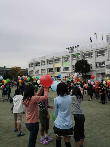 記念集会!バルーンリリース!!学校自慢を書いて飛ばしました♪やさしい校長先生が大人気でした♪