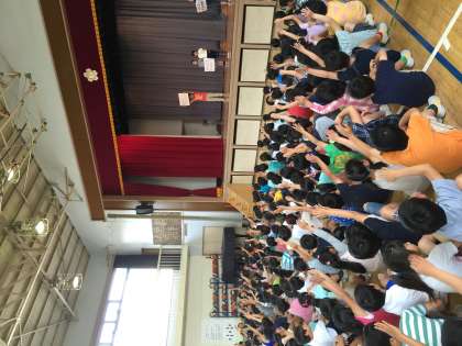 今日の児童集会は集会委員がジェスチャーをやるので、三択で当てるというゲームと同じ誕生日月の人をジェスチャーを使って探すというゲームをやりました。みんな上手にジェスチャーを使って、同じ誕生月の人を探していました。