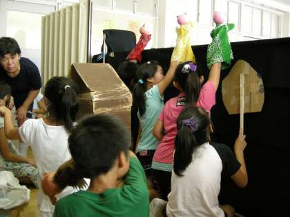 4年3組のお店は「わくわく人形劇場」。4つのグループに分かれて、個性豊かな人形劇を上演しました。みんなで協力して音を出したり、助け合いながら演じた劇は、大評判でした。