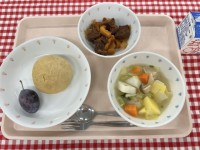 《献立》 チキンピラフ 牛乳 イカのオニオンソース 野菜のバジルスープ フルー...