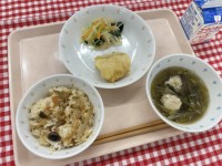 《和食の日にちなんだ献立》 ごぼうときのこのごはん 牛乳 秋はもの天ぷら ゆず香...