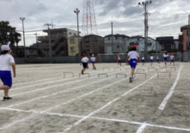 体育の学習では「小型ハードル走」を行い、自分にあったコースを選び、リズムよく走り越すことを目標に練習を繰り返しました。