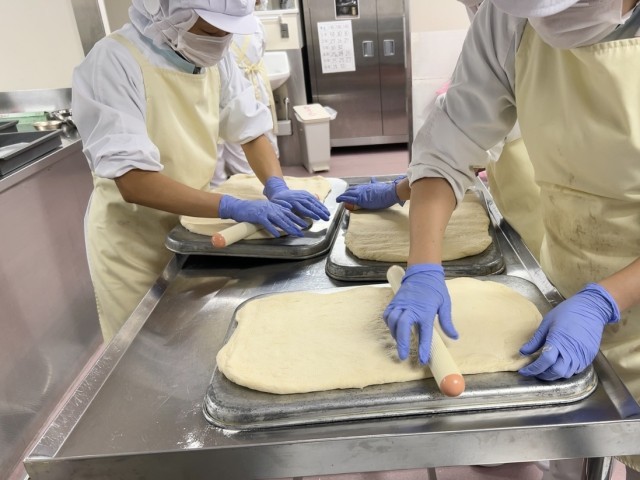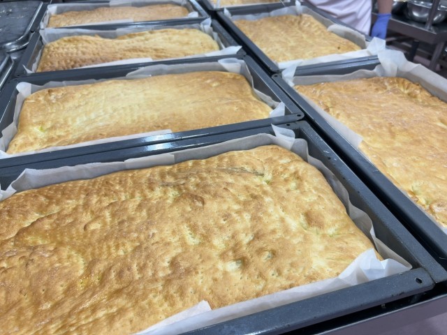 オリーブオイルを加えた生地をのばし、大きな鉄板で焼いています。