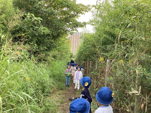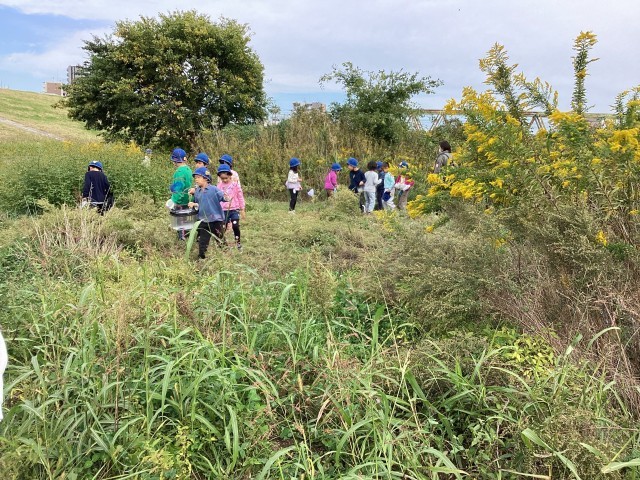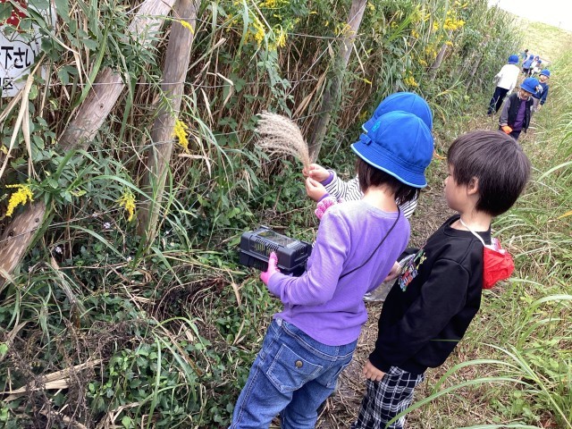 草道を進むと、高いところに大きな蜘蛛の巣を見つけ、大騒ぎの子供達でした。ススキやオナモミ(げじげじ)を初めて見た子達もいたようで、いくつも見つけては服に付け楽しんでいまいした。出発前までは「虫は嫌い…。」と言っていた子たちも「友達に取ってもらったよ!」「こわくなかったよ!」と笑顔になっていたのが印象的でした。