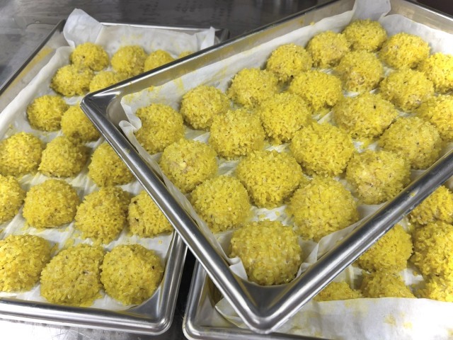 菊の花をイメージして、ターメリックで色をつけたもち米を肉団子にまぶしています。