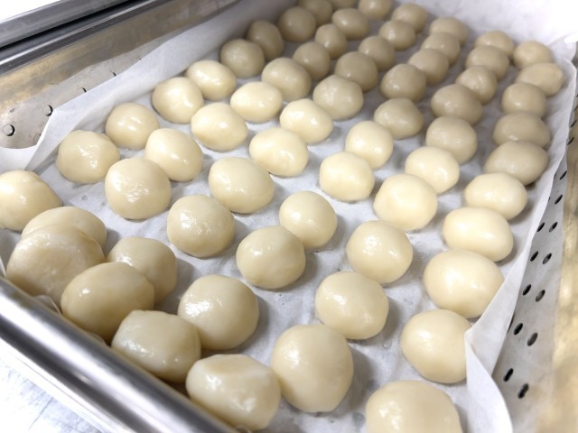 1人分ずつ丸め、ふっくらと蒸しあげたものを手作りのみたらしタレと和えて完成です!