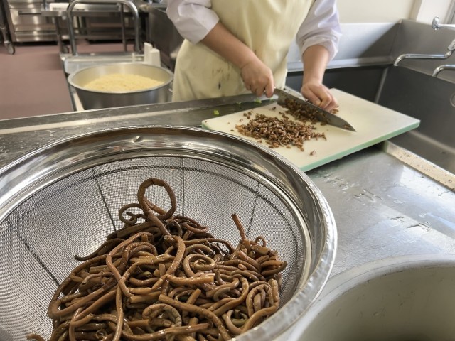 切り干し大根、国産のぜんまい、高野豆腐を細かく刻み、豚ひき肉と一緒に炒めています。