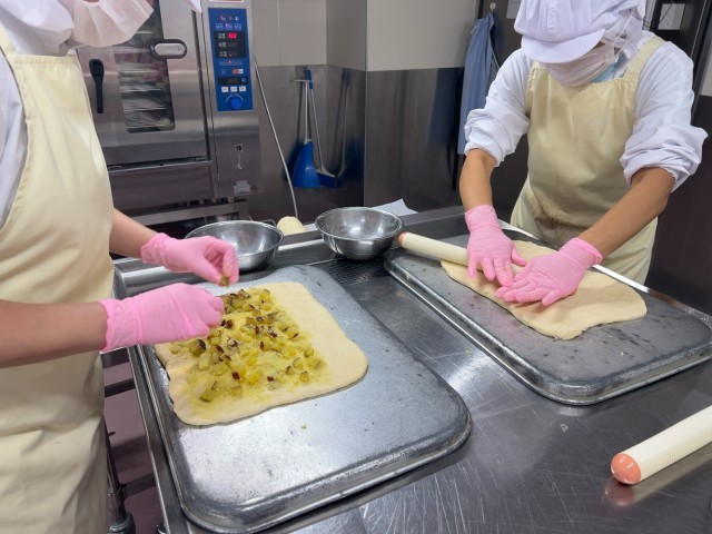 さつまいもは、豆乳と合わせてペーストにしたものと角切りにしたものを巻き込んでいます。