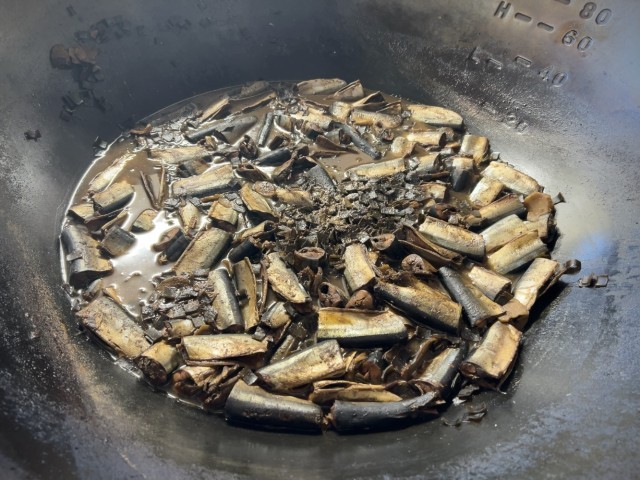 昆布・生姜と一緒に、さんまを大きな鍋で約3時間かけてコトコトと煮ています。