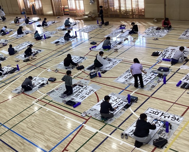 初めての毛筆での書き初め。大きい紙と太い筆に苦戦している様子でした。広い体育館で書くことに緊張しながらも、お手本をよく見て、静かで落ち着いた雰囲気の中、のびのびと書くことができました。