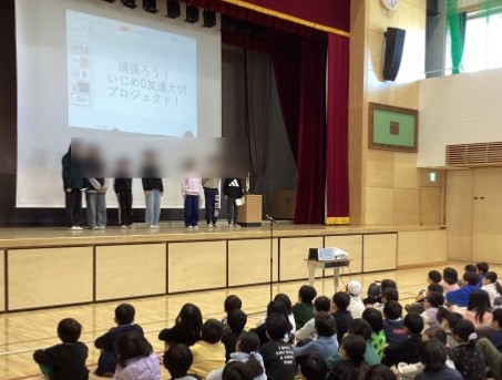 「いじめは絶対にだめ」「いじめのない学校にしよう」「友達を大切にしよう」という代表委員の話をみんなが真剣に聞いていました。