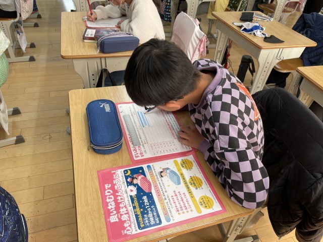 また、江戸川区の取組「すいみんの記録カード」に記入し、自分の睡眠時間について振り返り、睡眠の大切さについて考えました。
