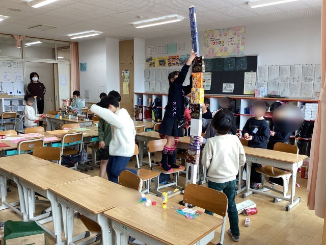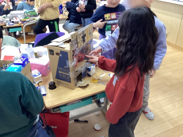 1学期よりバージョンアップし、友達と一緒に箱と箱を組み合わせて工作をしました。お互いにアイディアを出し合い、試行錯誤しながら組み立てていました。子供たちは、廃材を世界に一つの代物に変える天才です!