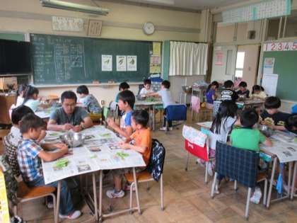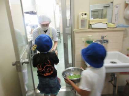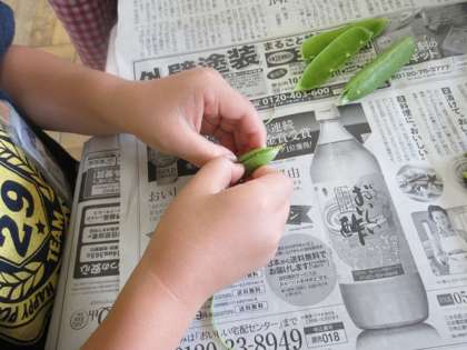 先週の1組、2組に引き続き、8日に1年3組でグリーンピースのさやむきを行いました。1組、2組の話を聞いてか3組の児童は心待ちにしていたようです!まずは絵本の読み聞かせ。栄養士からはきぬさやが大きくなるとグリーンピースになることや、グリーンピースがえんどう豆の仲間であることを話しました。さや剥きのお手本を見せてから実際にさや剥き開始です☆最初の1つはみんなで一斉にむきました。最初は難しかったすじ取りも、コツをつかむとあっという間にできるようになる子供たち!余裕が出てくると、「○個入ってたよー」や「上手にむけたよー」と教えてくれました。むき終わったグリーンピースは子供たちが調理室に運び、調理さんに直接手渡しました。この日は給食のポークビーンズで登場します!