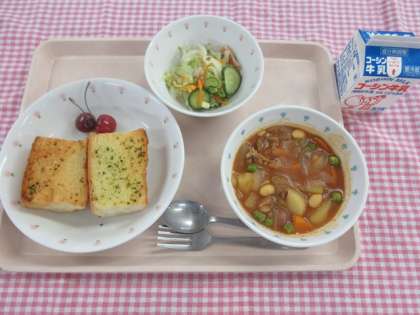 この日のかみかみメニューはフランスパンを使った「ガーリックトースト」です。1年生の教室に行くと「先生、このパンおいしいけどかたいよー」という声が。かむとよいことがたくさんあること、だからみんなによく噛んで食べてほしくて今週はかみかみメニューを出していることを伝えると、みんなしっかり噛んで食べてくれました。そんなかむことには8つのいいことがあると言われています。お昼の放送でそのうちの2つを紹介しました。1つ目は肥満防止です。よくかむとお腹がいっぱいというサインが頭にいって、食べすぎを防ぐことができます。2つ目は味覚の発達です。よく噛むと色々な味をしっかり味わうことができて、味覚が育ちます。残りは9日と10日に紹介します☆