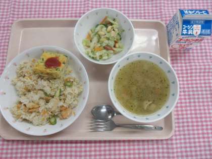 えびアスパラピラフ 小松菜のキッシュ 2種の豆サラダ アルファベットスープ 牛乳