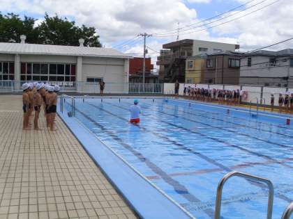 1年生は小岩小の水泳の約束を真剣に聞き、2年生は1年生の見本になるように、しっつかりとルールを守って頑張っていました。