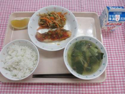 ごはん 鮭のチリソース アーモンド入り中華和え チンゲン菜としめじのスープ 河内晩柑 牛乳